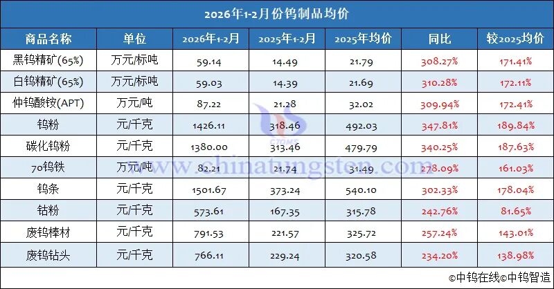 2026年1-2月份,65%黑钨精矿均价59.14万元/标吨,同比2025年1-2月份均价上涨308.27%,2月底较年初报价上涨73.91%。65%白钨精矿均价59.03万元/标吨,同比上涨310.28%,2月底较年初报价上涨74.07%。仲钨酸铵均价87.22万元/吨,同比上涨309.94%,2月底较年初报价上涨79.10%。钨粉均价1426.11元/千克,同比上涨347.81%,2月底较年初报价上涨79.63%。碳化钨粉均价1380.00元/千克,同比上涨340.25%,2月底较年初报价上涨80.77%。70钨铁均价82.21万元/吨,同比上涨278.09%,2月底较年初报价上涨72.31%。钨条均价1501.67元/千克,同比上涨302.33%,2月底较年初报价上涨78.76%。钴粉均价573.61元/千克,同比上涨242.76%,2月底较年初报价上涨11.54%。废钨棒材均价791.53元/千克,同比上涨257.24%,2月底较年初报价上涨83.33%。废钨钻头均价766.11元/千克,同比上涨234.20%,2月底较年初报价上涨86.21%。