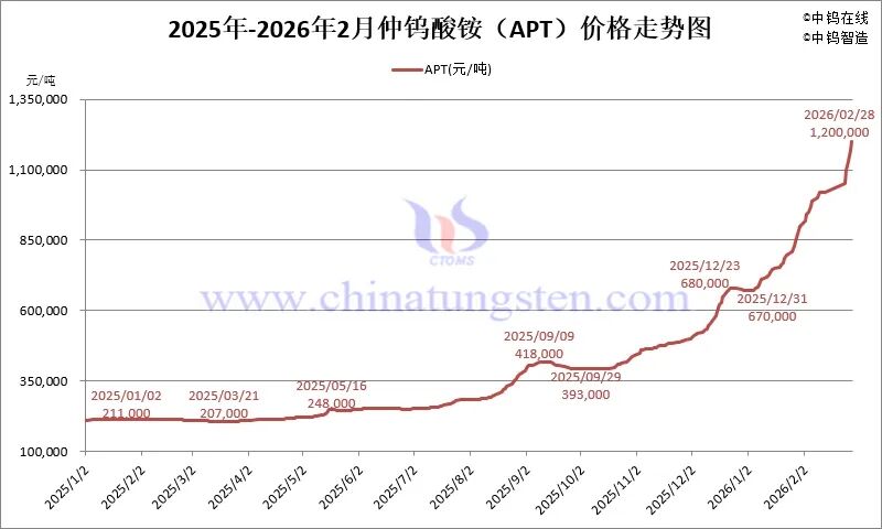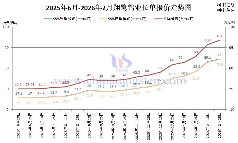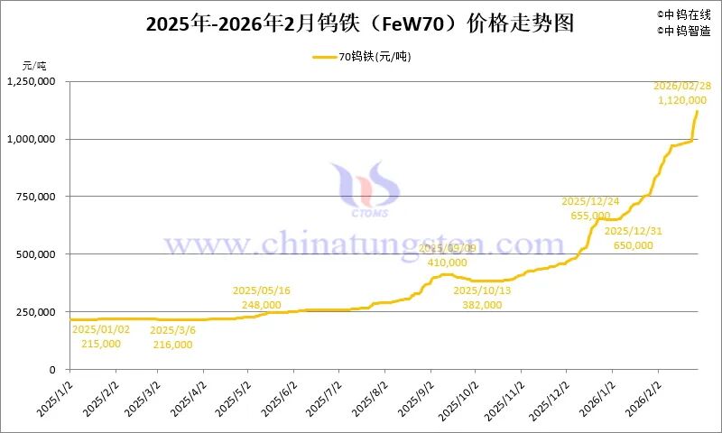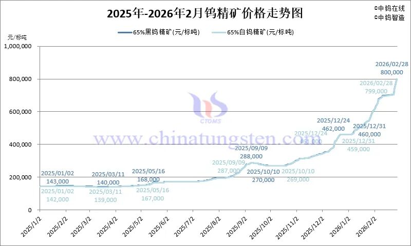 2026年2月份,中国钨市场持续展现强劲势头。除春节假期前三日的趋稳行情,主要钨原料产品价格基本呈现日涨1-6万的跳涨形势,累计月涨幅达30%,年内累计涨幅已近80%。