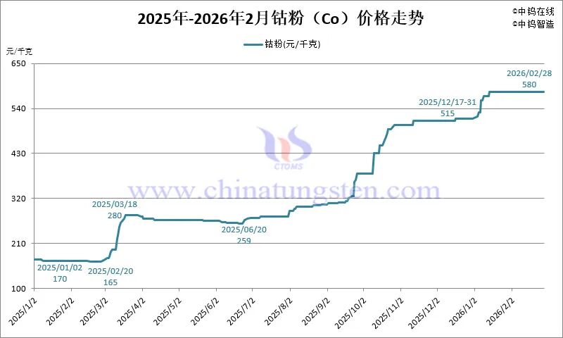 2026年2月份,65%黑钨精矿均价69.87万元/吨,同比2025年2月份均价上涨382.36%,环比2026年1月份均价上涨35.70%;月末较月初报价上涨29.03%。65%白钨精矿均价69.77万元/吨,同比上涨385.02%,环比上涨35.86%;月末较月初报价上涨29.08%。仲钨酸铵均价103.33万元/吨,同比上涨385.79%,环比上涨36.48%;月末较月初报价上涨30.43%。钨粉均价1704.00元/千克,同比比上涨434.79%,环比上涨38.81%;月末较月初报价上涨29.33%。碳化钨粉均价1652.67元/千克,同比上涨426.95%,环比上涨39.44%;月末较月初报价上涨29.66%。70钨铁均价97.07万元/吨,同比上涨345.26%,环比上涨35.58%;月末较月初报价上涨31.76%。钨条均价1784.00元/千克,同比上涨375.73%,环比上涨37.23%;月末较月初报价上涨27.85%。钴粉均价580.00元/千克,同比上涨248.41%,环比上涨1.92%;月末较月初报价持平。废钨棒材均价903.33元/千克,同比上涨307.68%,环比上涨26.93%;月末较月初报价上涨27.91%。废钨钻头均价872.00元/千克,同比上涨280.87%,环比上涨26.29%;月末较月初报价上涨30.12%。